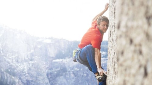 Two free climbers attempt to scale a seemingly unscalable rock face.